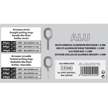 Comprenant : – 50x droits N°4 Al-Special (059559) – 50x droits N°5 AlMg3 (059511) – 50x droits N°6 AlMgSi (059474) – 20x torsadés N°4 Al-Special (059566) – 20x torsadés N°5 AlMg3 (059528) – 20x torsadés N°6 AlMgSi (059481)