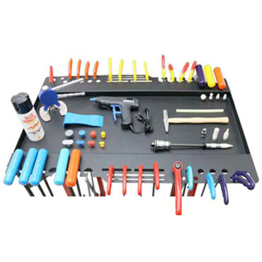 Le chariot extensible avec support pour leviers de débosselage sans peinture (DSP) et étagère inférieure (réf. 31456) combine leviers DSP, colle thermofusible et ventouses. Il peut accueillir jusqu’à 44 leviers de débosselage. Sa forme permet de transporter tous les outils nécessaires aux travaux de carrosserie, notamment les leviers de débosselage et le système de colle thermofusible.
