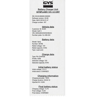 – Compatible avec les chargeurs GYSFLASH CNT, le module ultra-compact SPM assure la traçabilité en imprimant un résumé du cycle de charge sous forme de ticket.