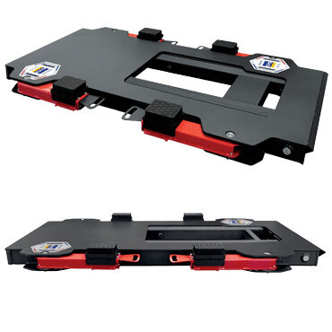 4 grandes roues clipsables permettent de transformer le pont élévateur en chariot roulant. Le véhicule peut ainsi être déplacé facilement dans l’atelier.